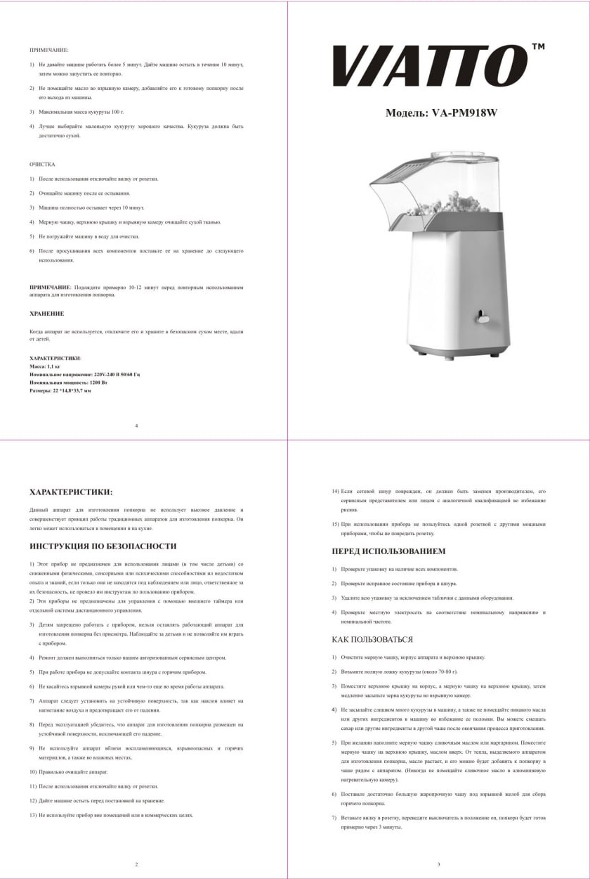 Попкорница VIATTO VA-PM918W используется в домашних условиях для приготовления воздушной кукурузы без использования масла с различными вкусовыми добавками. Корпус выполнен из пластика, чаша - из алюминия с антипригарным покрытием, крышка - из прозрачного поликарбоната.