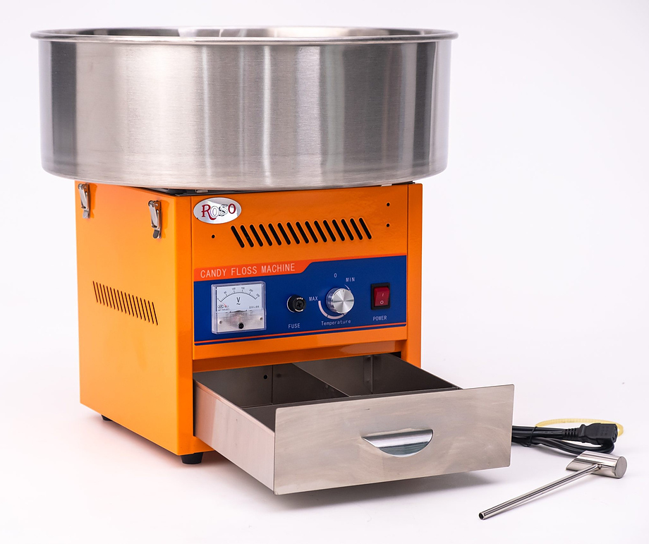 Аппарат для сахарной ваты Rosso HEC-01 используется на предприятиях общественного питания и торговли. Модель оснащена рабочей головкой с ТЭНом, термостатом, вольтметром и выдвижным ящиком для принадлежностей. Чаша-ловитель выполнена из нержавеющей стали.