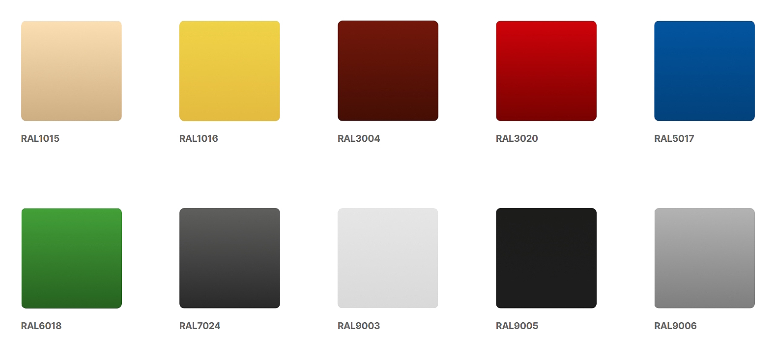 Модель доступна в 10 стандартных цветовых исполнениях фронтальной панели по таблице RAL.