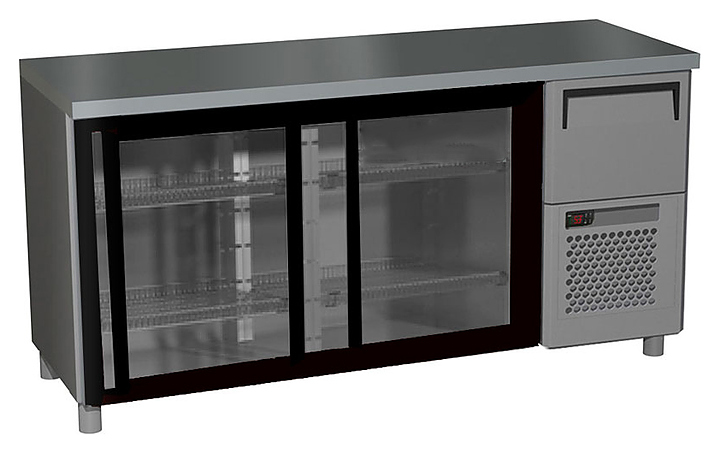 Холодильный стол Сarboma T57 M2-1-C 0430 (BAR-360К) предназначен для охлаждения и кратковременного хранения скоропортящихся продуктов и напитков на предприятиях общественного питания и торговли. Модель оснащена 2 раздвижными дверьми-купе, охлаждаемым ящиком над агрегатом, 4 полками и регулируемыми ножками высотой от 90 до 110 мм. Цельнозаливной корпус выполнен из нержавеющей стали, дверцы - из стекла.
