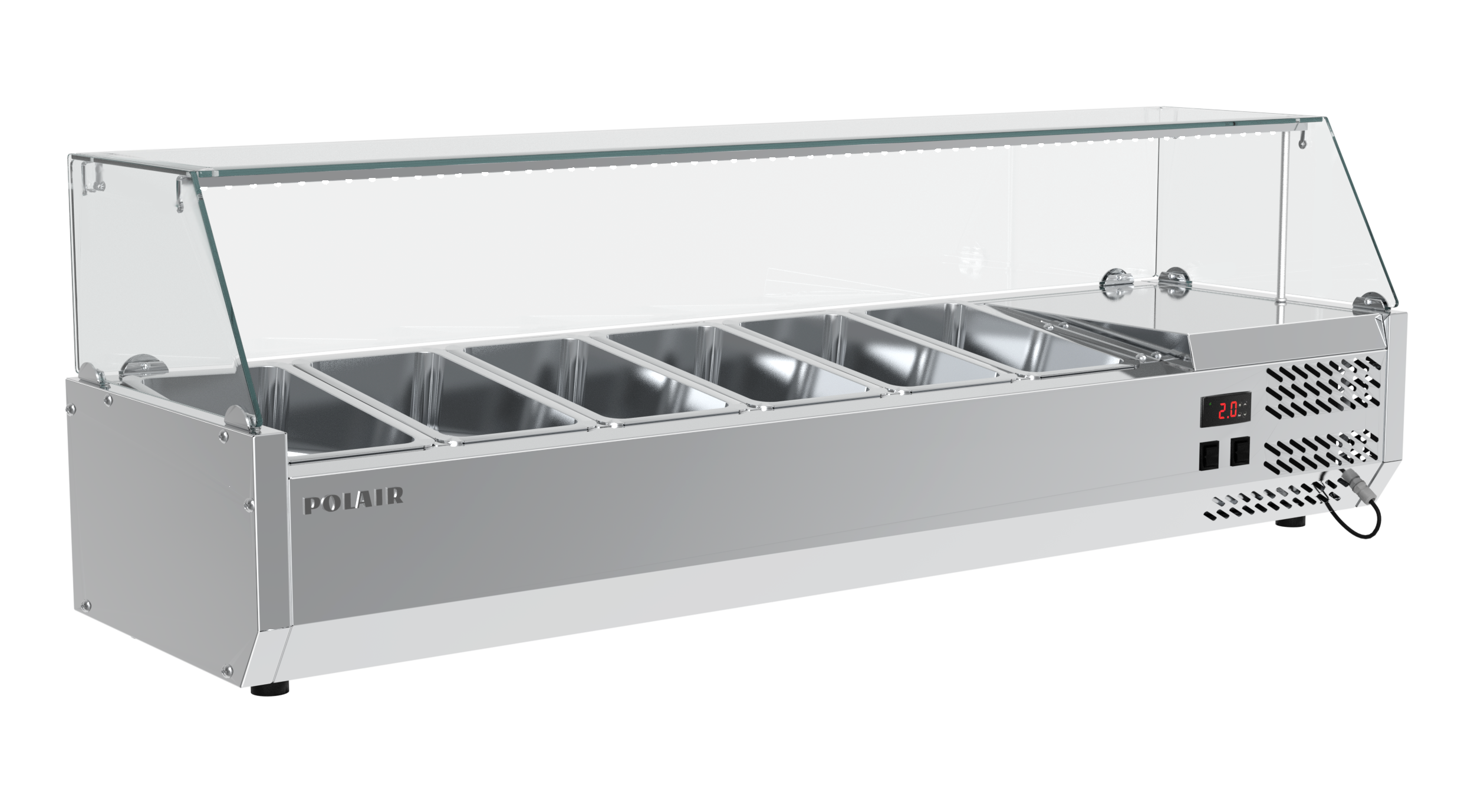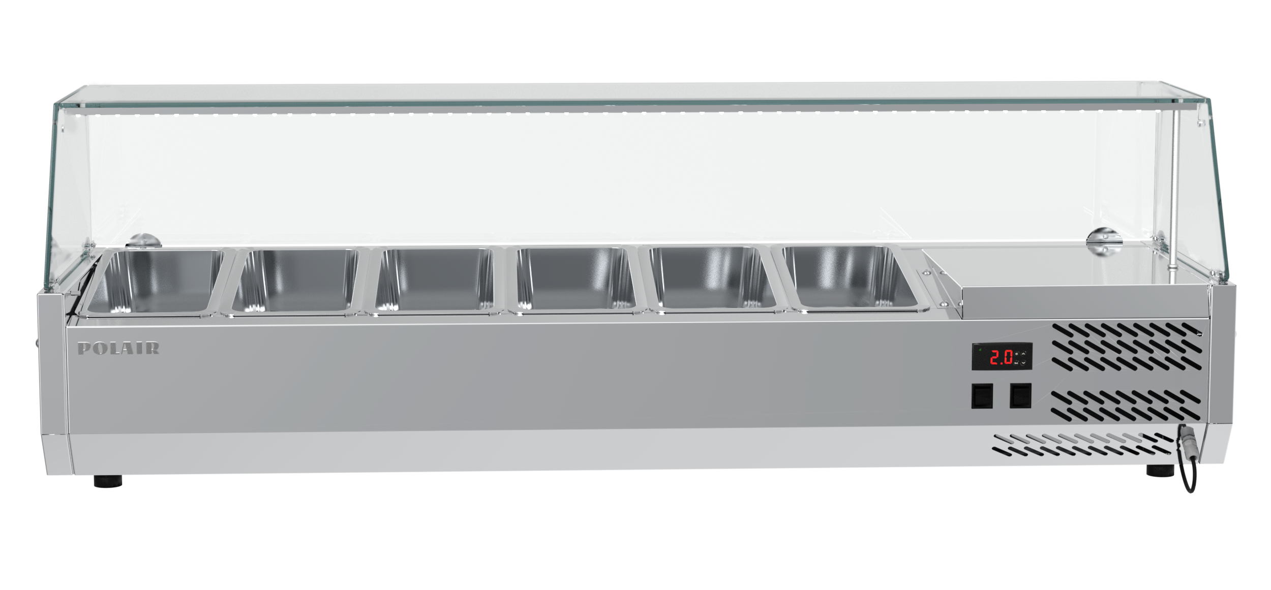 Настольная охлаждаемая витрина (витрина для ингредиентов) POLAIR VT2vEN 1/3 предназначена для кратковременного хранения ингредиентов при приготовлении пиццы и салатов, а так же демонстрации и продажи предварительно охлажденных пищевых продуктов в гастрономических ёмкостях на предприятиях торговли и общественного питания.