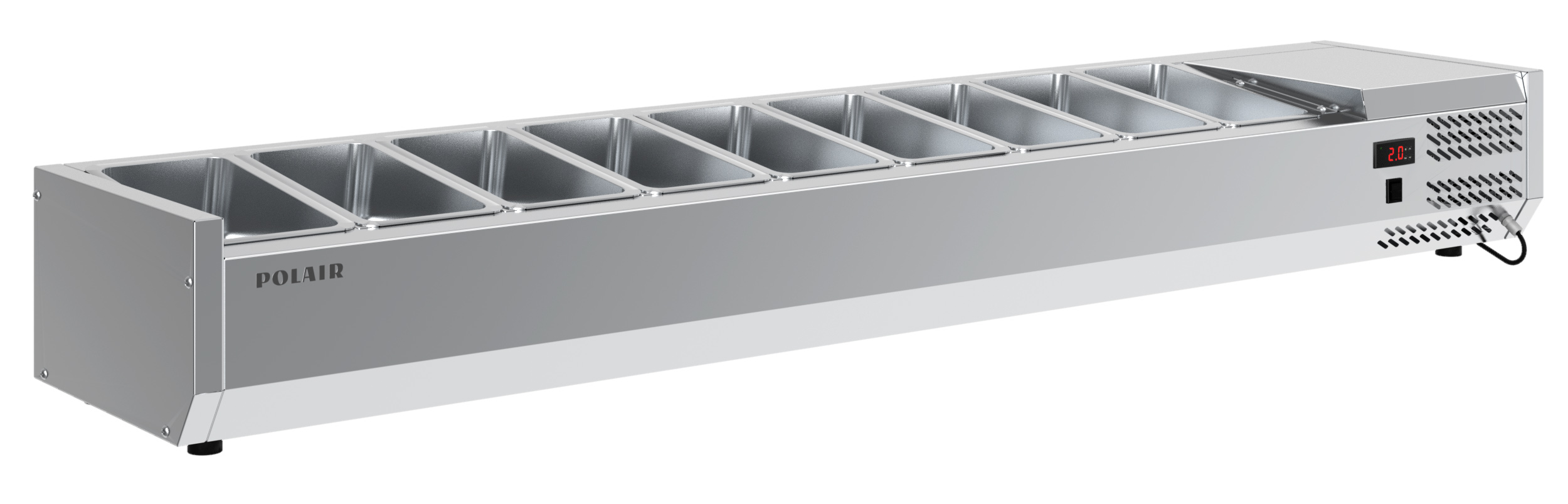 Настольная охлаждаемая витрина (витрина для ингредиентов) POLAIR VT3EN 1/3 предназначена для кратковременного хранения ингредиентов при приготовлении пиццы и салатов, а так же демонстрации и продажи предварительно охлажденных пищевых продуктов в гастрономических ёмкостях на предприятиях торговли и общественного питания.