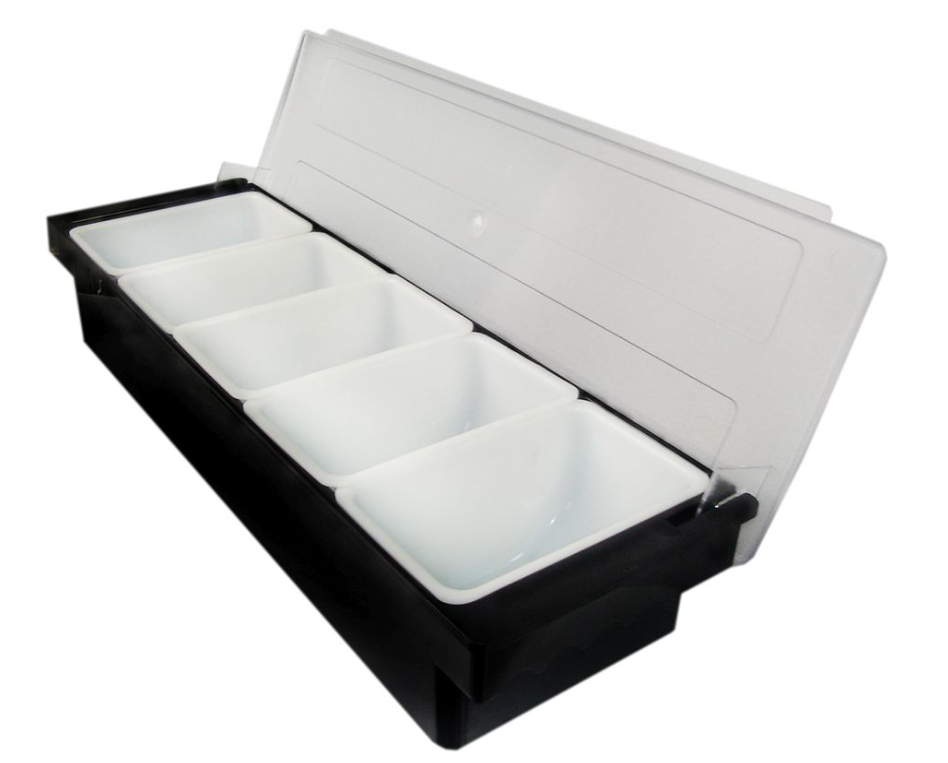 Контейнер для бара Kitchen MuseJW-B5B- пластмассовый настольный контейнер для бара с откидной крышкой и 5 лотками для размещения ингредиентов (оливок, коктейльных вишен, лимона, лайма и т.п.). Габариты: 500х160х90. Размер лотка 90x141x73 мм.