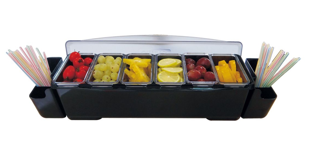 Контейнер для бара Kitchen Muse JW-BN6D- пластмассовый настольный контейнер для бара с откидной крышкой и 6 лотками для размещения ингредиентов (оливок, коктейльных вишен, лимона, лайма и т.п.).