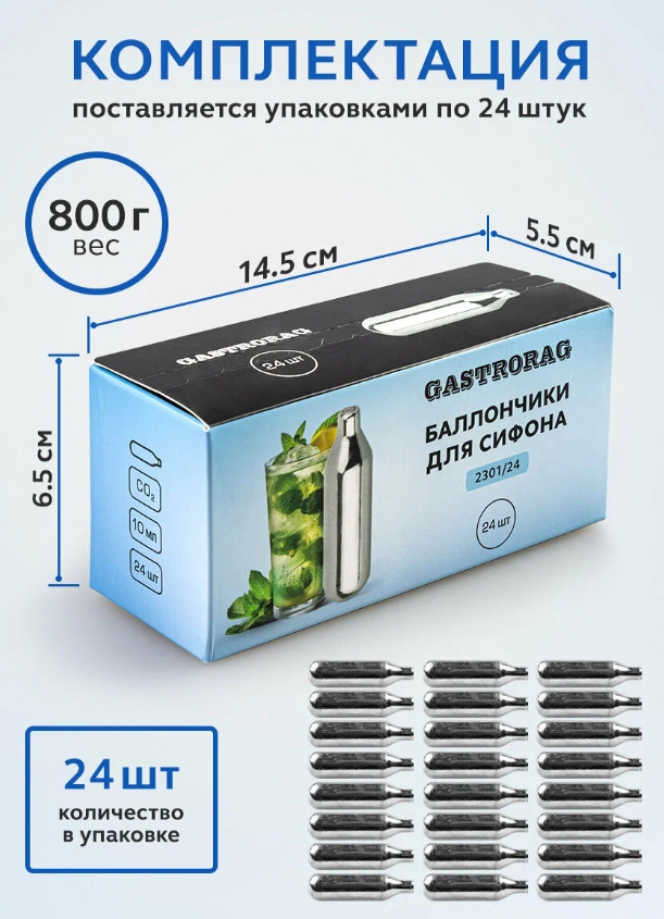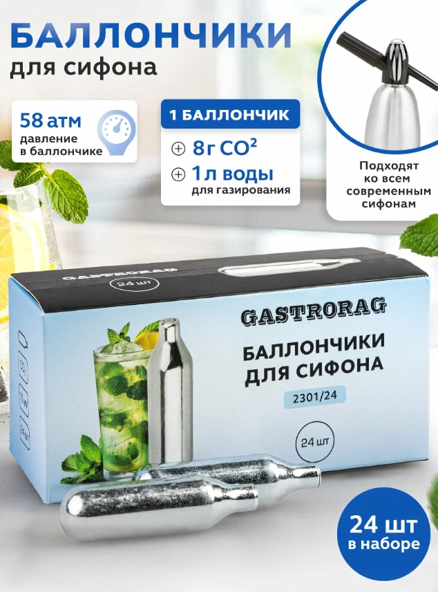 Баллончики для сифона GASTRORAG 2301/24 предназначены для газирования напитков. Изделие выполнено из углеродистой стали.