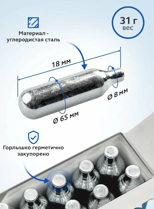 - Содержание углекислого газа в 1 баллончике: 8 г