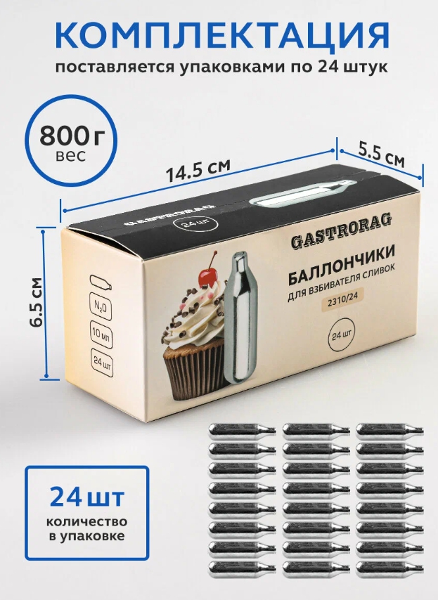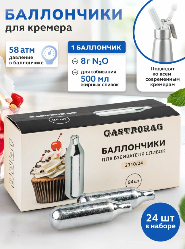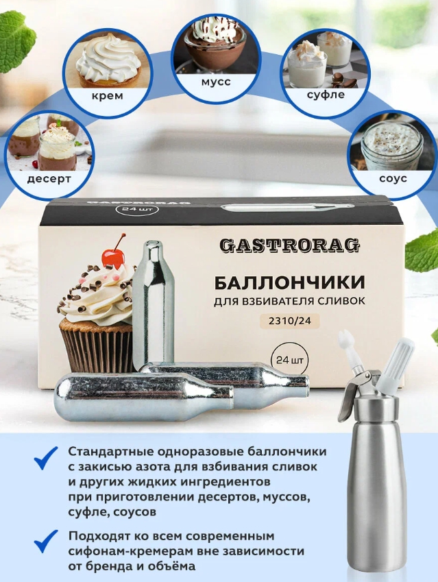 Баллончики для взбивания сливок GASTRORAG 2310/14 представляют собой стандартные одноразовые баллончики с N2O (закисью азота) для взбивания сливок и других жидких ингредиентов при приготовлении десертов, муссов, суфле, соусов и других блюд.