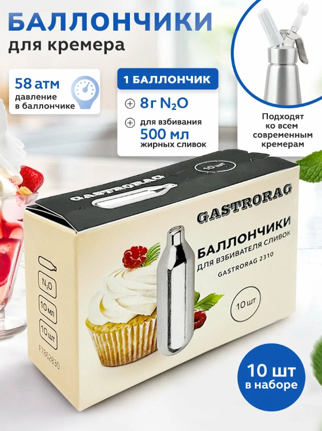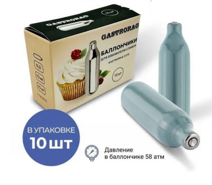 Баллончики для взбивания сливок GASTRORAG 2310 представляют собой стандартные одноразовые баллончики с N2O (закисью азота) для взбивания сливок и других жидких ингредиентов при приготовлении десертов, муссов, суфле, соусов и других блюд.