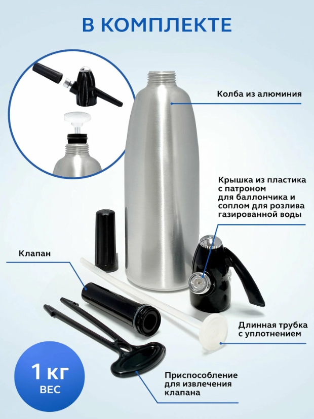 В комплект поставки входят колба, крышка с патроном для газового баллончика и дозатором, мерная трубка, длинная трубка с шайбой и приспособление для извлечения мерной трубки из колбы.