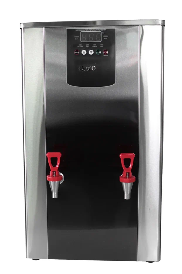Электрокипятильник ROSSO GSK02 проточного типа предназначен для быстрого нагрева воды и поддержания ее температуры в течение длительного времени на предприятиях общественного питания и торговли. Модель оснащена электродами, посылающими сигнал на микрокомпьютер, который активирует нагревательный элемент и электромагнитный клапан, регулируя температуру и объем подачи воды. Корпус выполнен из нержавеющей стали.