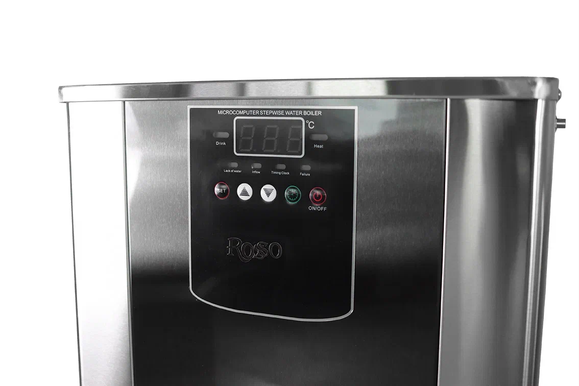 Электрокипятильник ROSSO GSK06 проточного типа предназначен для быстрого нагрева воды и поддержания ее температуры в течение длительного времени на предприятиях общественного питания и торговли. Модель оснащена электродами, посылающими сигнал на микрокомпьютер, который активирует нагревательный элемент и электромагнитный клапан, регулируя температуру и объем подачи воды. Корпус выполнен из нержавеющей стали.