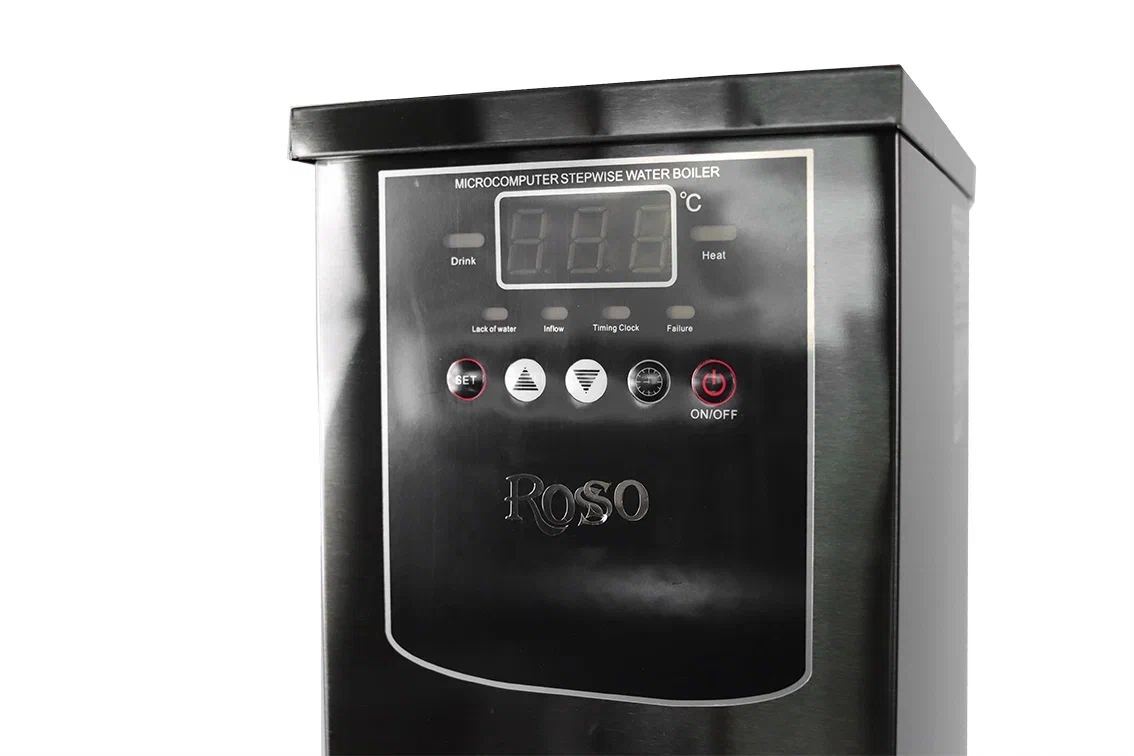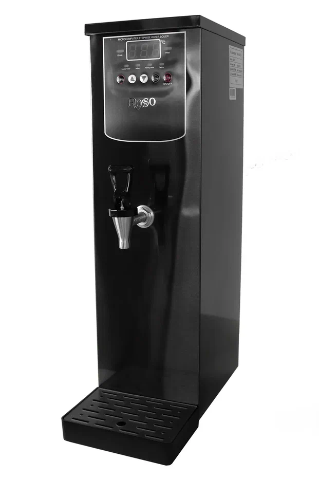 Электрокипятильник ROSSO LXB015 проточного типа предназначен для быстрого нагрева воды и поддержания ее температуры в течение длительного времени на предприятиях общественного питания и торговли. Модель оснащена электродами, посылающими сигнал на микрокомпьютер, который активирует нагревательный элемент и электромагнитный клапан, регулируя температуру и объем подачи воды. Корпус выполнен из нержавеющей стали.