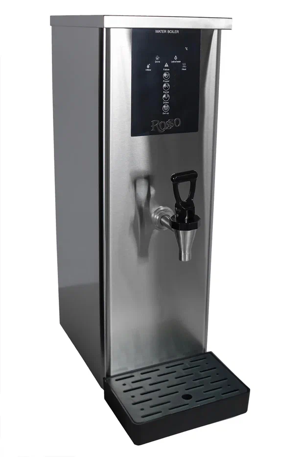 Электрокипятильник ROSSO LXS03 проточного типа предназначен для быстрого нагрева воды и поддержания ее температуры в течение длительного времени на предприятиях общественного питания и торговли. Модель оснащена электродами, посылающими сигнал на микрокомпьютер, который активирует нагревательный элемент и электромагнитный клапан, регулируя температуру и объем подачи воды. Корпус выполнен из нержавеющей стали.