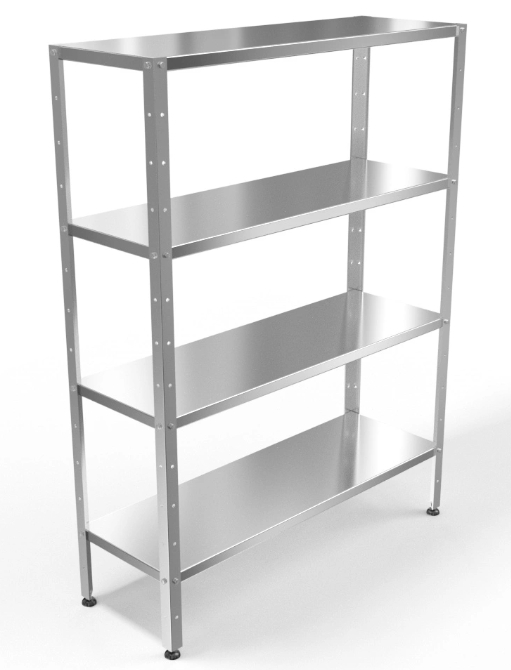 Стеллаж кухонный EKSI СК-1500/500/1800-с+, 4 сплошные полки выполненные из нерж. стали марки AISI 430, толщина 0,8 мм, каркас разборный - уголок из стали AISI 430 (1,5мм) толщиной. Максимальная распределенная нагрузка на полку до 50 кг