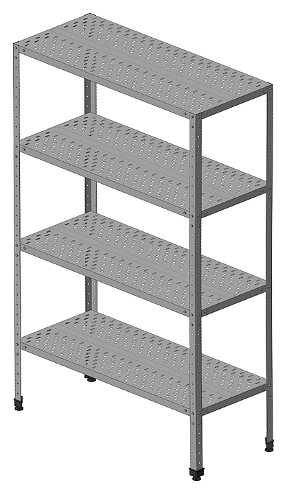 Стеллаж ITERMA серии T&T СТК-П-Э-15/3 предназначен для хранения посуды, кухонной утвари и сухих продуктов на предприятиях общественного питания и торговли. Модель оснащена ножками, регулирующимися по высоте. Разборный каркас выполнен из оцинкованной стали, перфорированные полки, усиленные ребром жесткости, - из нержавеющей стали AISI 430 толщиной 0,5 мм.