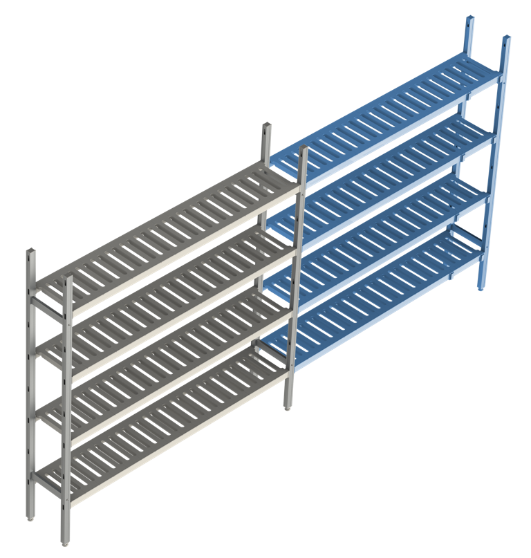 Модульный стеллаж POLAIR LOAD.ME POLY 18AL.4PP40.13E (дополнительная секция, 4 яруса) предназначен для хранения продукции в холодильных и морозильных камерах, кухнях, лабораториях, на предприятиях общественного питания и торговли. Модель оснащена 4 регулируемыми по высоте полками-решетками (шаг регулировки: 150 мм) и ножками. Каркас выполнен из анодированного алюминиевого профиля, полки - из полипропилена, ножки - из прочного композитного сплава.
