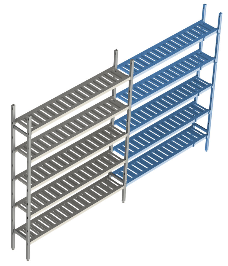 Модульный стеллаж POLAIR LOAD.ME POLY 18AL.5PP40.15E (дополнительная секция, 5 ярусов) предназначен для хранения продукции в холодильных и морозильных камерах, кухнях, лабораториях, на предприятиях общественного питания и торговли. Модель оснащена 5 регулируемыми по высоте полками-решетками (шаг регулировки: 150 мм) и ножками. Каркас выполнен из анодированного алюминиевого профиля, полки - из полипропилена, ножки - из прочного композитного сплава.