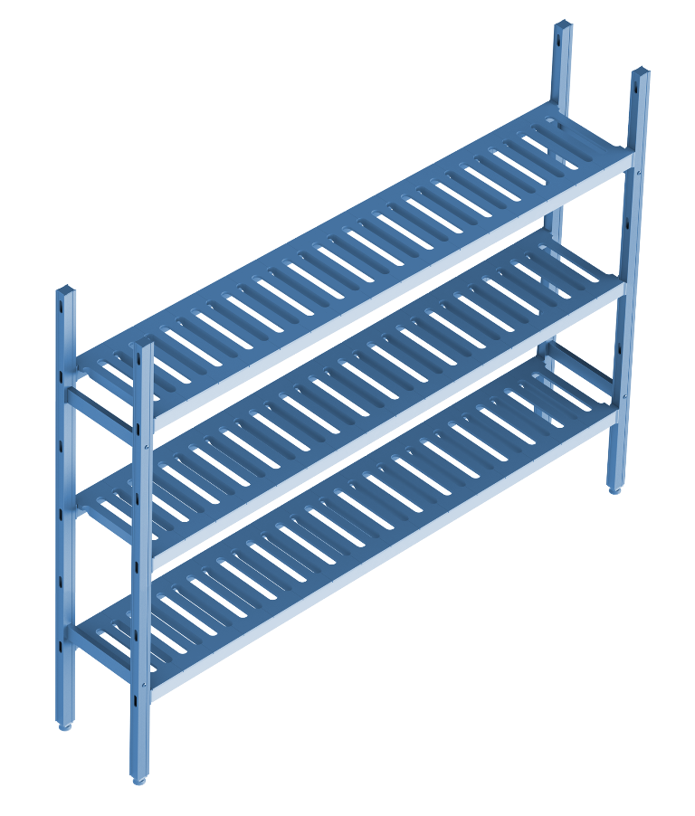 Модель представляет собой базовую секцию модульной стеллажной системы и может использоваться как самостоятельно, так и стыковаться в линию с дополнительными линейной и угловой секциями.