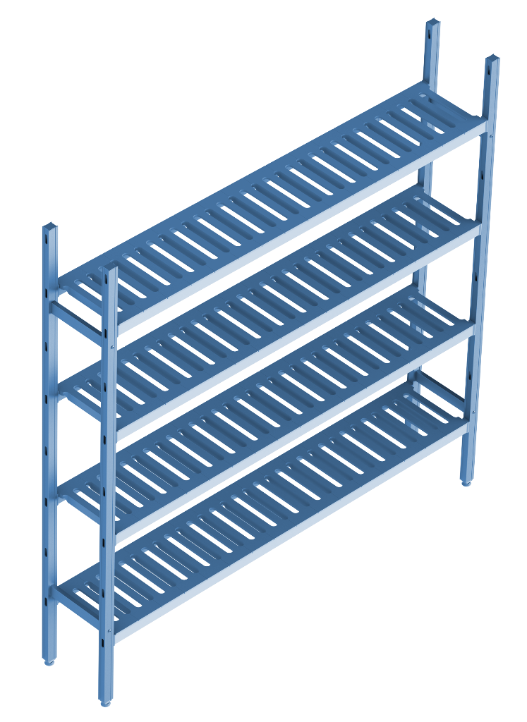 Модель представляет собой базовую секцию модульной стеллажной системы и может использоваться как самостоятельно, так и стыковаться в линию с дополнительными линейной и угловой секциями.