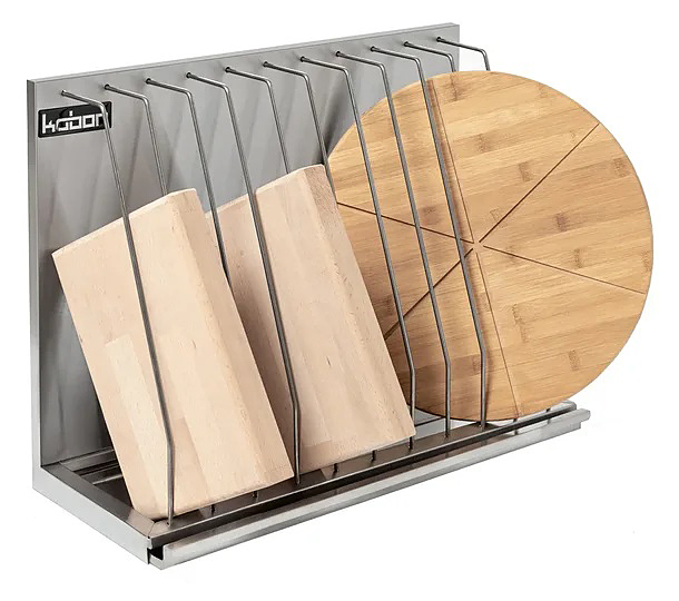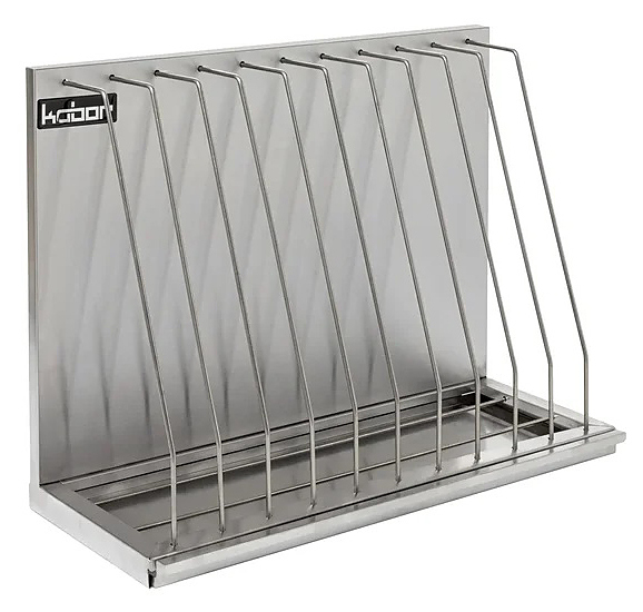Полка настенная для досок КОБОР ПКД-60/35. Полка для досок имеет широкие ячейки, что позволяет хранить до 9 досок разной толщины. Внизу полки предусмотрен специальный поддон для сбора воды стекающей с досок. Поддон легко вынимается и жидкость из него удаляется. Полка изготовлена из нержавеющей стали aisi 430.