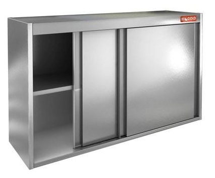 Полка настенная HICOLD НПК-6/3 с дверцами-купе из нержавеющей стали AISI 430 используется для хранения непортящихся продуктов и полуфабрикатов, а также кухонной посуды: сковородок, тарелок, кружек и прочего на предприятиях общественного питания.