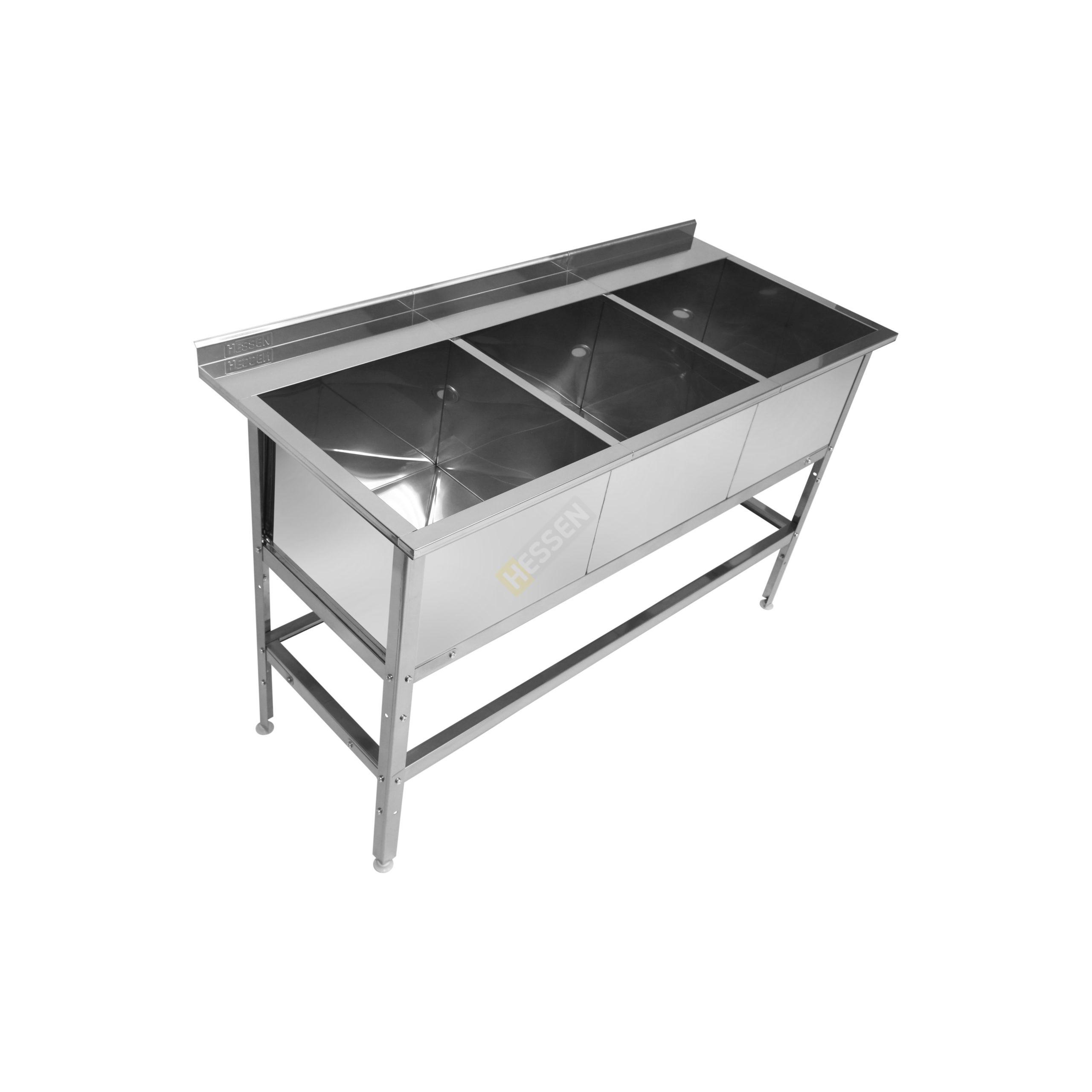 Ванна моечная с бортом на 3 емкости HESSEN ВМП предназначена для мытья посуды и кухонного инвентаря на предприятиях общественного питания, пищевой промышленности и торговли.