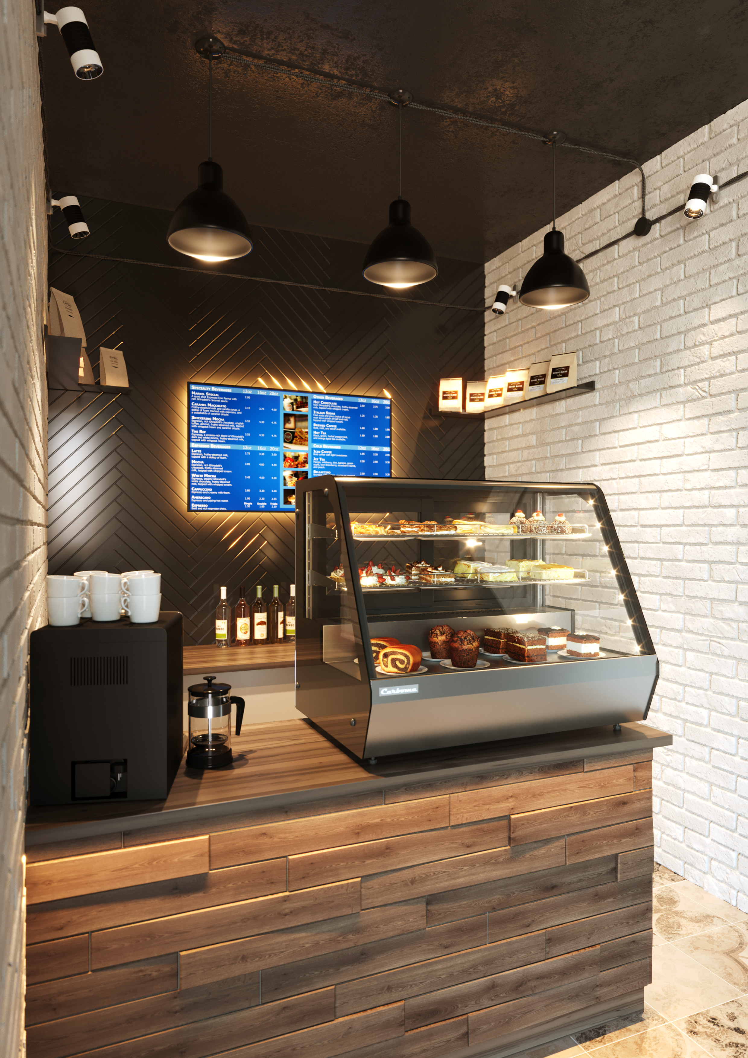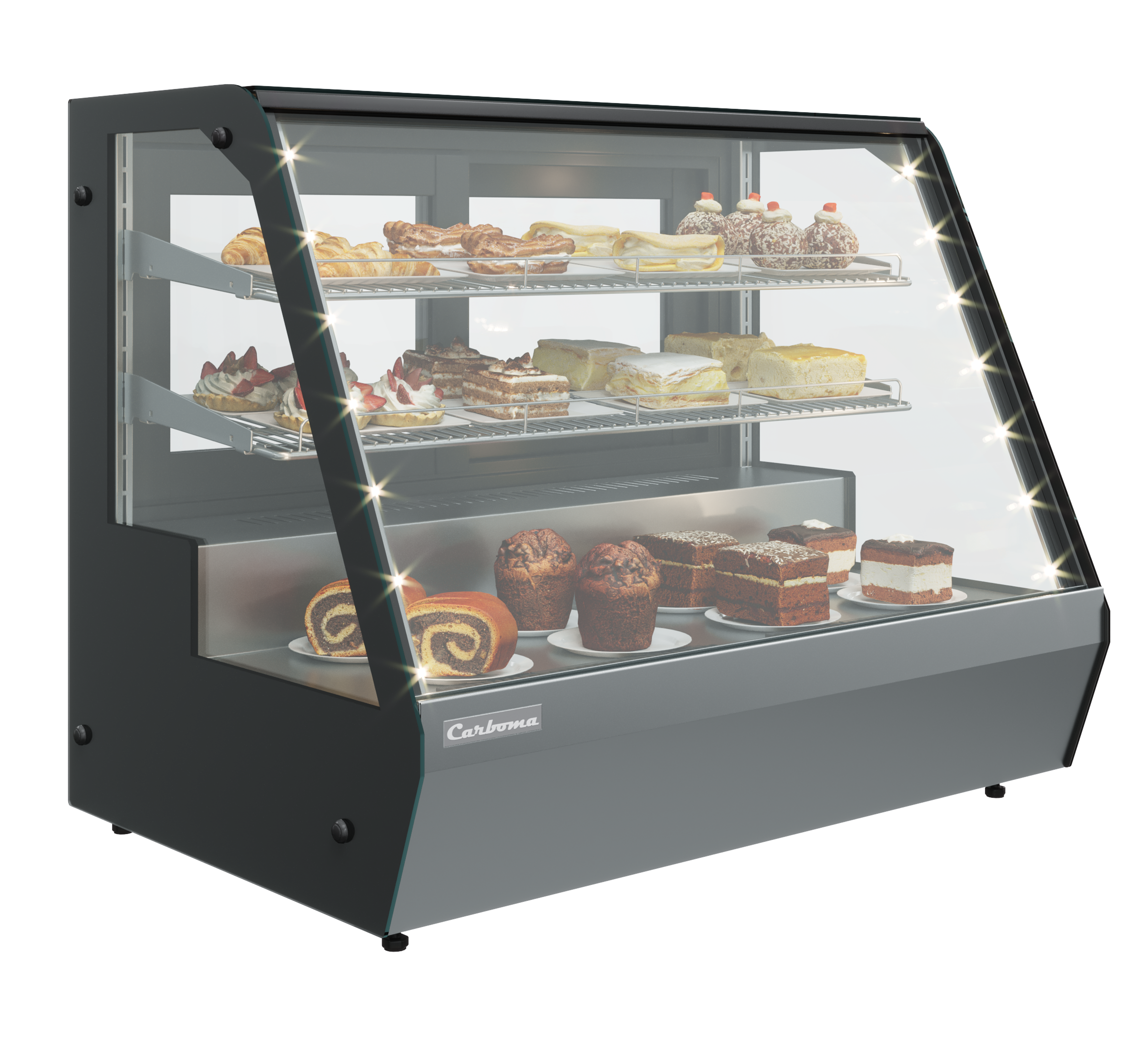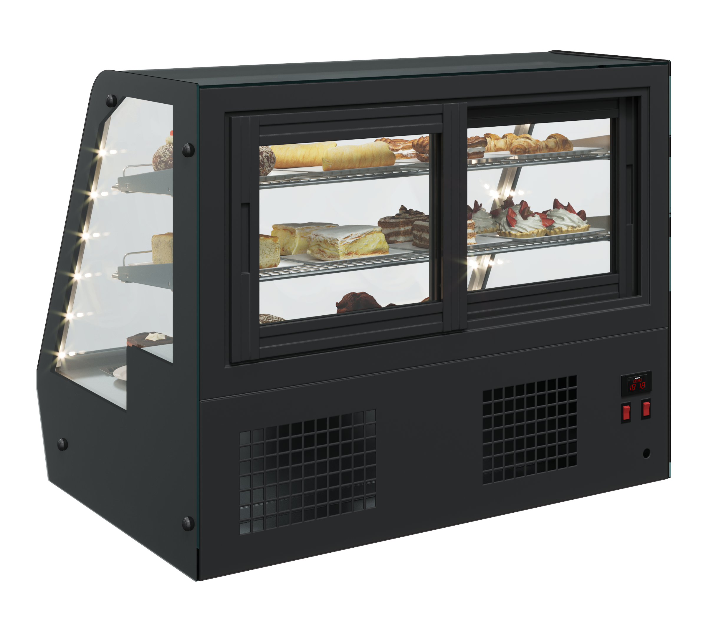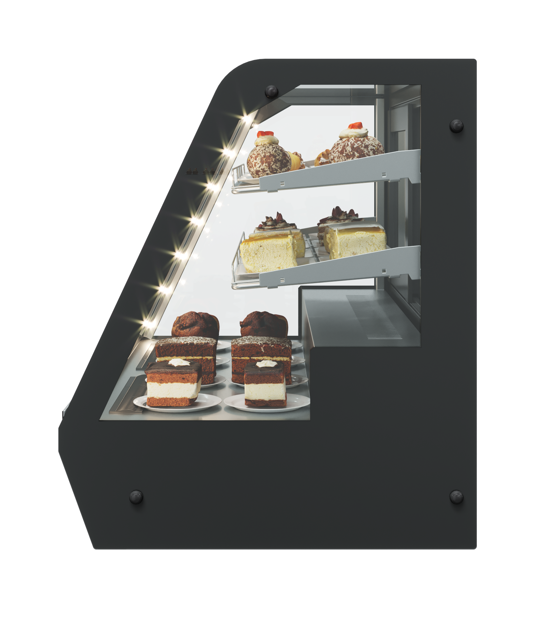 - Боковое LED-освещение, раскрывающее многослойность структуры пирожных и десертов