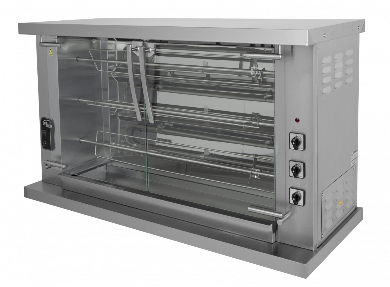 Гриль для кур GRILL MASTER Ф3Ш1Э используется на предприятиях общественного питания и торговли для обжаривания целых тушек кур на вертелах (шампурах). Корпус и все внутренние элементы, контактирующие с продуктами, выполнены из пищевой нержавеющей стали AISI 430, двери - из закаленного термостойкого стекла.