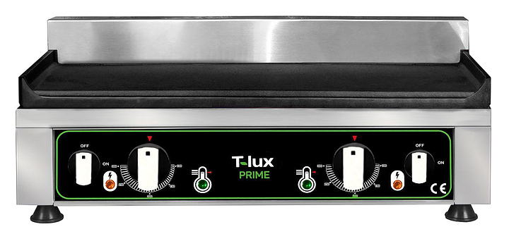 Жарочная поверхность T-LUX GP 5530 S серии PRIME используется для обжарки и разогрева мяса, рыбы, колбасок, сосисок, сарделек, шпикачек, котлет для бургеров, овощей и других продуктов питания в ресторанах, кафе, гриль-барах, стейк-хаусах, в фаст-фуд заведениях и на других предприятиях общественного питания и торговли. Модель оснащена 2 зонами нагрева, электромеханической панелью управления, терморегулятором, индикаторами нагрева и питания. Боковые вентиляционные отверстия обеспечивают отвод горячего воздуха и предотвращают перегрев внутренних компонентов. Отсутствие острых краев по бокам гарантирует безопасную эксплуатацию. Корпус выполнен из нержавеющей стали AISI 430, рабочие поверхности - из чугуна.