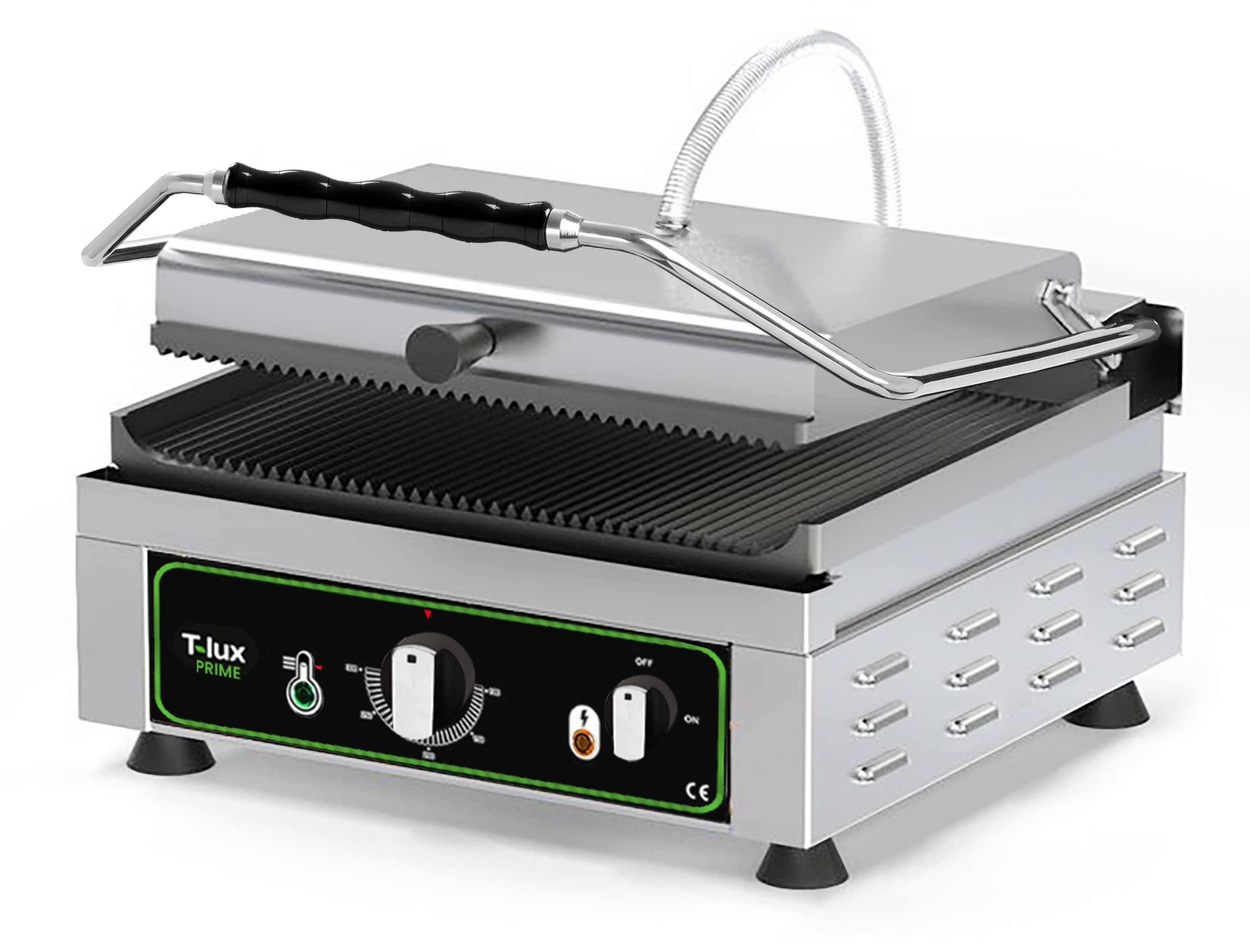 Прижимной гриль T-LUX CG 2745 RR серии PRIME предназначен для жарки мяса, овощей, птицы, рыбы, а также для приготовления гамбургеров и горячих сэндвичей в ресторанах, кафе, гриль-барах, стейк-хаусах, фаст-фуд заведениях и других предприятиях общественного питания и торговли. Модель оснащена механическим термостатом, накладками на рукоятках из термостойкого пластика для безопасного захвата и устойчивыми ножками. Корпус выполнен из нержавеющей стали, жарочная поверхность - из чугуна.