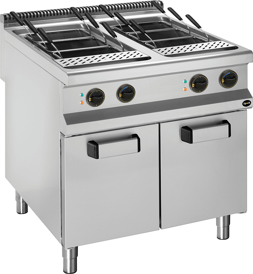 Макароноварка Apach APPE-89P 900-й серии используется на предприятиях общественного питания и торговли для приготовления спагетти, пасты и прочих изделий из теста. Модель оснащена закрытым шкафом с 2 распашными дверцами и электромеханической панелью управления с 2 терморегуляторами, 2 таймерами и 4 световыми индикаторами. Корпус, рабочая поверхность, панель управления и вытяжная решетка выполнены из нержавеющей стали AISI 304, дверца, боковые и задние панели - из нержавеющей стали AISI 430, ванна - из нержавеющей стали AISI 316, нагревательные элементы - из нержавеющей стали.