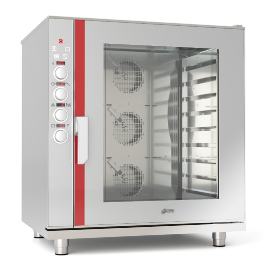 Устройство оснащено 3 вентиляторами с реверсом с регулируемой скоростью. Печь полностью выполнена из нержавеющей стали AISI 430. Дверь оборудована силиконовым уплотнением и двойным закалённым стеклом, которое может быть откинуто, что при необходимости позволяет легко осуществлять чистку оборудования изнутри и между стекол.