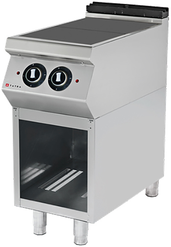 Электрическая плита Tatra TER.49F 900 серии предназначена для приготовления различных блюд в наплитной посуде на предприятиях общественного питания и торговли. Модель оснащена электромеханической панелью управления, открытой подставкой, 2 конфорками и регулируемыми ножками. Корпус выполнен из нержавеющей стали, конфорки - из чугуна.
