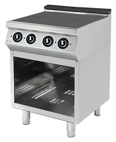 Электрическая плита Tatra TER.89F 900 серии предназначена для приготовления различных блюд в наплитной посуде на предприятиях общественного питания и торговли. Модель оснащена электромеханической панелью управления, открытой подставкой, 4 конфорками и регулируемыми ножками. Корпус выполнен из нержавеющей стали, конфорки - из чугуна.