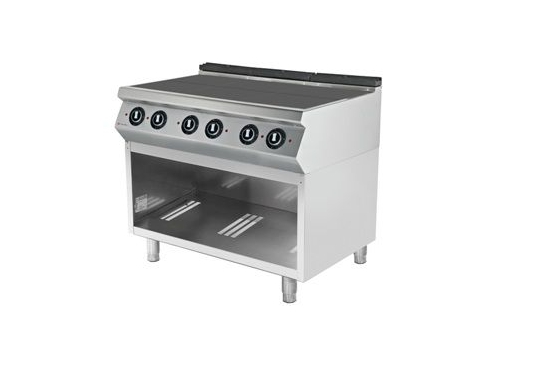 Электрическая плита Tatra TER.129F 900 серии предназначена для приготовления различных блюд в наплитной посуде на предприятиях общественного питания и торговли. Модель оснащена электромеханической панелью управления, открытой подставкой, 6 конфорками и регулируемыми ножками. Корпус выполнен из нержавеющей стали, конфорки - из чугуна.