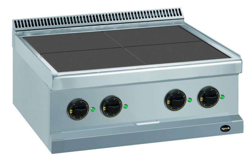 Электрическая плита Apach APRE-77T 700-й серии предназначена для приготовления различных блюд из мяса, птицы, рыбы и овощей в наплитной посуде на предприятиях общественного питания и торговли. Модель оснащена электромеханической панелью управления, быстро нагревающимися конфорками, гидроизолированной прессованной поверхностью и выдвижным лотком для сбора остатков пищи, масла и жира. Корпус, рабочая поверхность, панель управления и вытяжная решетка выполнены из нержавеющей стали AISI 304, боковые и задняя панели - из нержавеющей стали AISI 430.