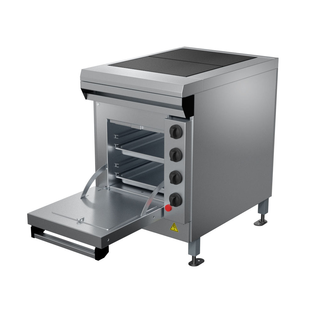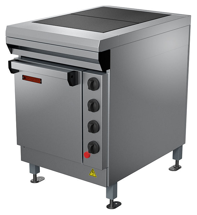 Рабочий стол плиты и лицевые панели из нержав. стали, каркас черный металл с полимерным покрытием.