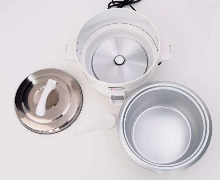 Рисоварка электрическая с алюминиевой вставкой с антипригарным (тефлоновым) покрытием имеет внутреннюю нагревательную пластину из алюминия.