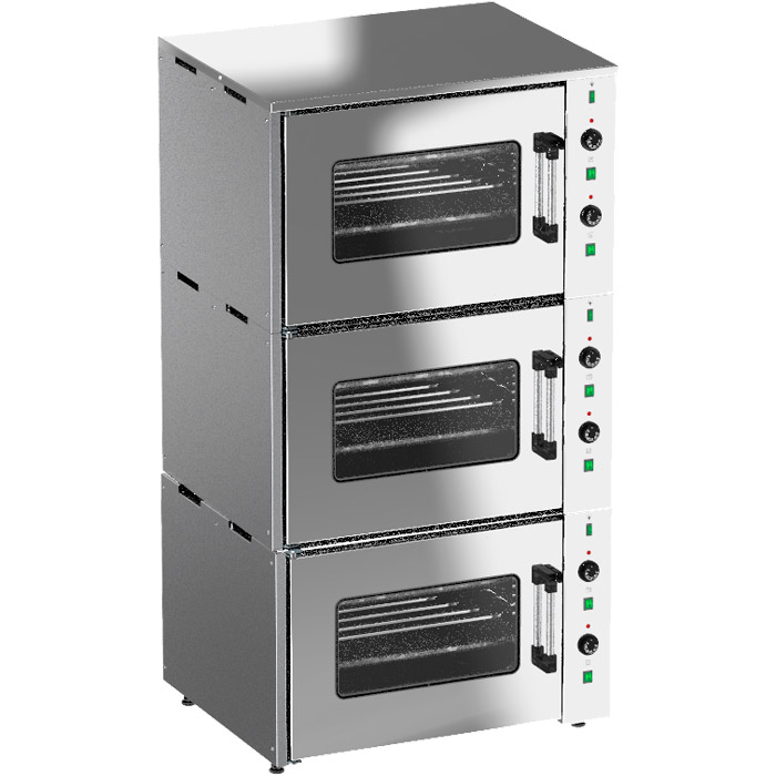 Жарочный шкаф Тулаторгтехника ШЖ-150-3с предназначен к эксплуатации на кухнях предприятий общественного питания для тепловой обработки продуктов. Размеры тепловых камер жарочного шкафа позволяют использовать противни или гастрономические ёмкости стандартного размера GN2/1 (650х530мм, глубиной от 20 до 200мм). Количество уровней в камере каждой секции шкафа для установки противней- 4. Температурный режим в каждой камере обеспечивается 2-я нижними и 2-я верхними ТЭНами. Нижние ТЭНы закрыты 2-я подовыми листами, верхние ТЭНы установлены открыто. Температура в камерах поддерживается в автоматическом режиме терморегуляторами.
