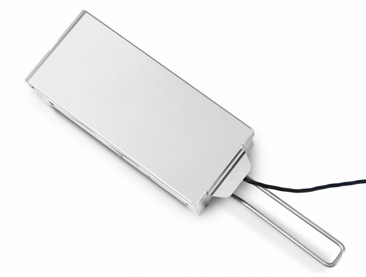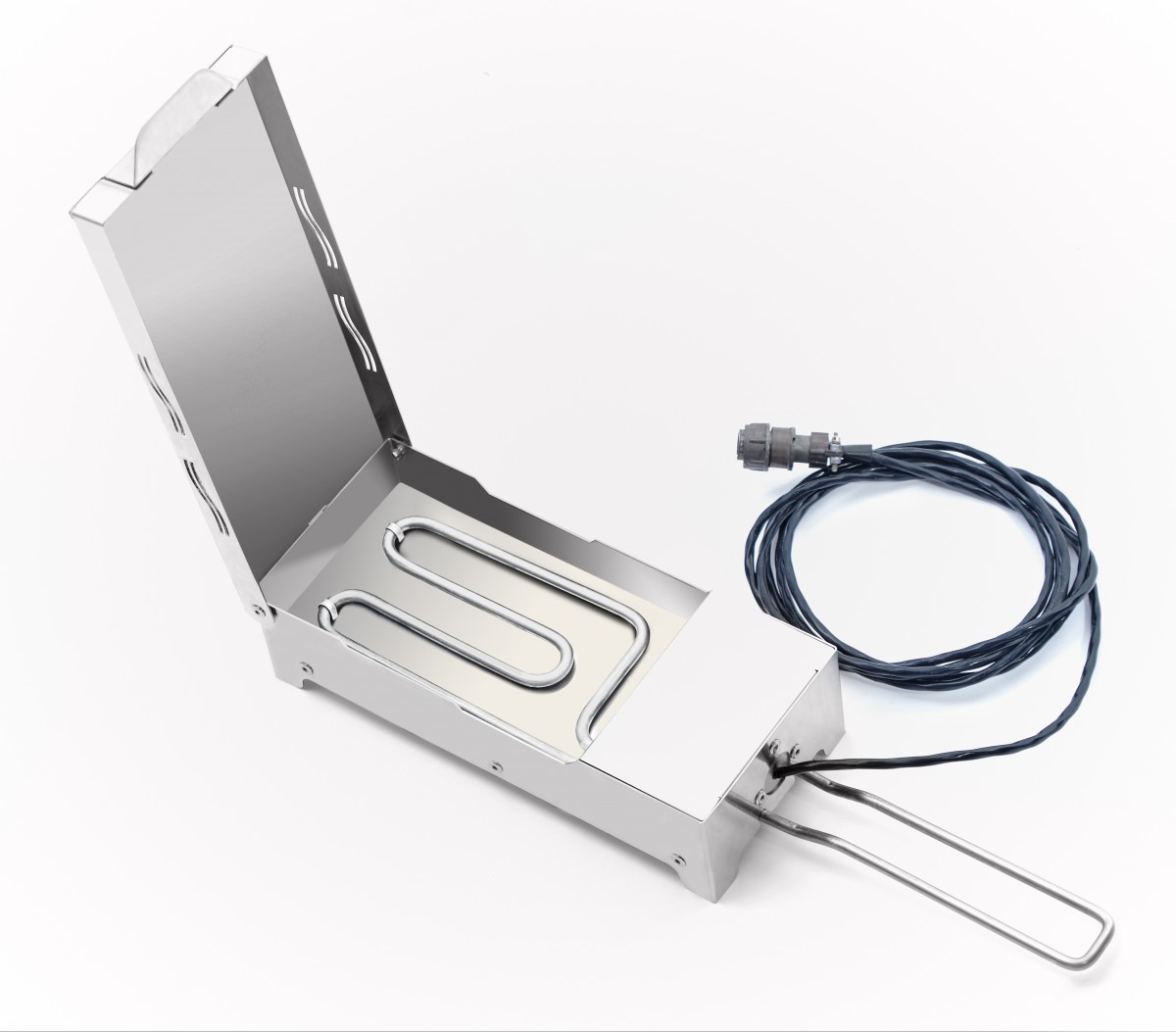 Дымогенератор состоит из контейнера для щепы и блока управления. Контейнер оснащен ручкой и подключается к блоку управления через вилку.
