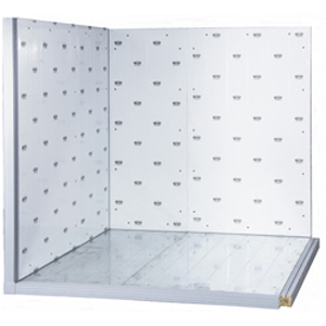Холодильная камера КХ-149,8 тм «Север», это модульная конструкция состоящая из теплоизоляционных сэндвич панелей толщиной 80мм. Сэндвич панели представляют собой элемент конструкции и двух листов оцинкованной стали толщиной 0,45 – 0,5мм, с залитой между ними теплоизоляцией (двухкомпонентный пенополиуретан) толщиной 80 мм. Половые панели холодильной камеры Север КХ-149,8 имеют толщину металла 1 – 1,2 мм. По торцам панели обрамлены морозостойким, ударопрочным пластиковым профилем. Профиль, в свою очередь, является соединительным элементом панелей с принципом крепления «шип-паз». На стеновые панели с двух сторон (на потолочную только с внутренней) нанесено полимерное покрытие RAL 9003, которое покрыто защитной пленкой с фирменным логотипом «Север». Пленка служит дополнительной защитой на время транспортировки и монтажа, после чего легко удаляется.