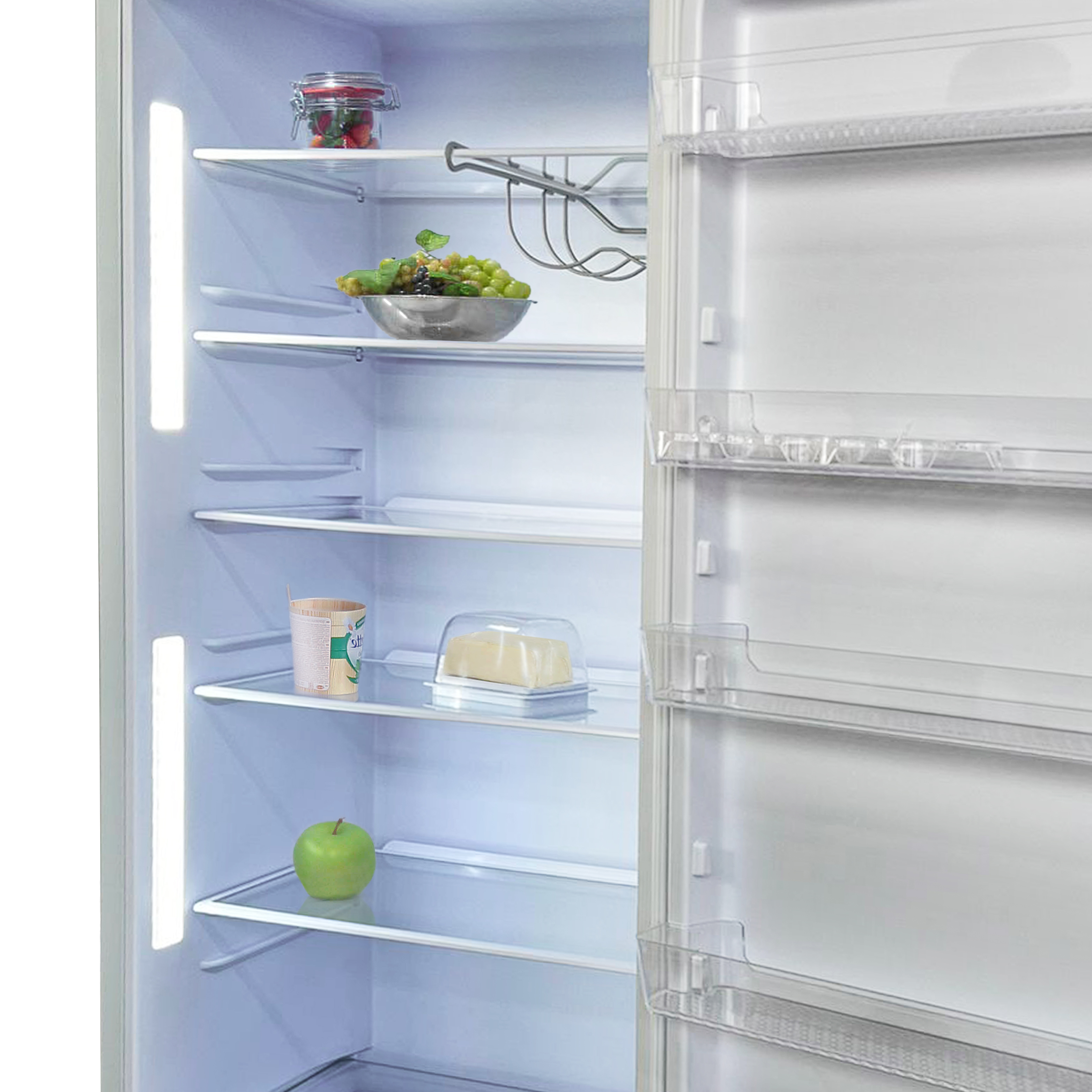 В комплект поставки входят масленка, подвесная металлическая полка для бутылок, 2 лотка для яиц, разделитель для фруктов и овощей.