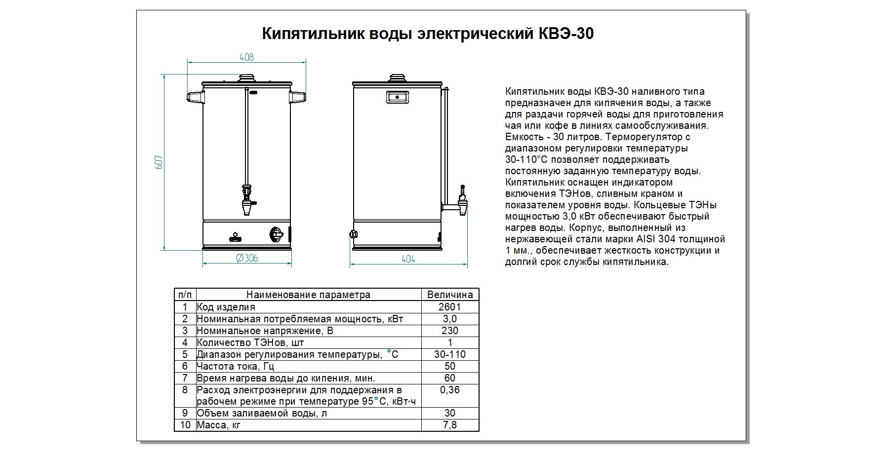 • Время нагрева воды до температуры кипения: 30 мин.