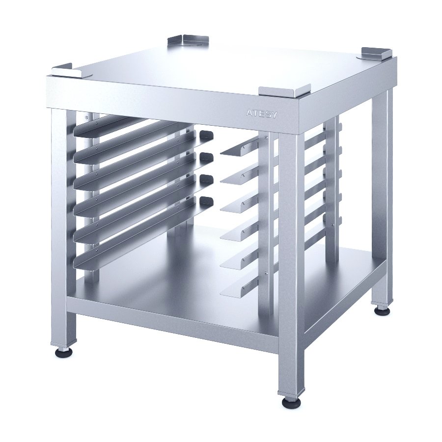Подставка под пароконвектомат ATESY ПДТ-Л-900.800.700-02 предназначена для установки на ней пароконвектоматов АПК «Рубикон». Выполнена из нержавеющей стали AISI 304, конструкция разборная.