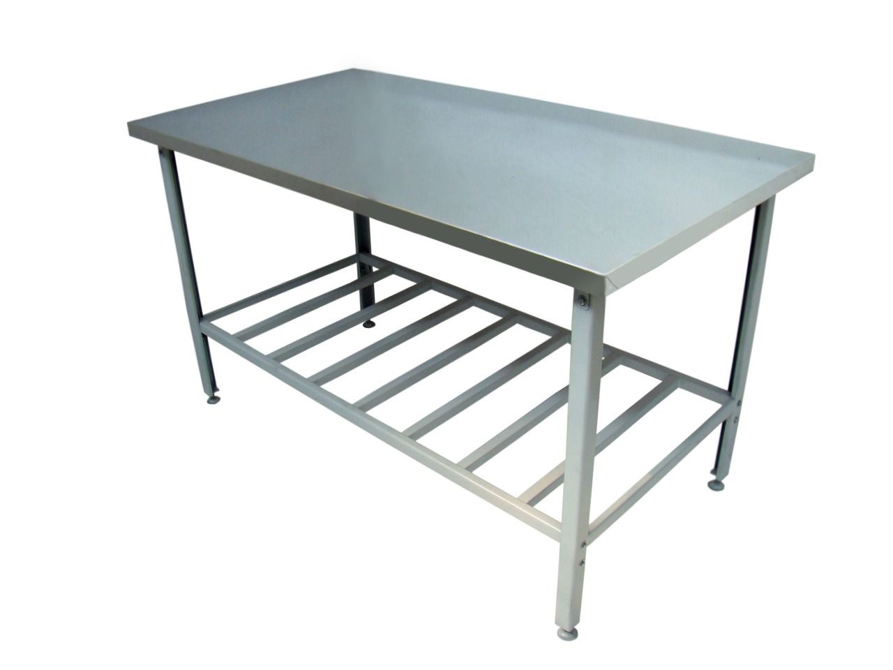 Ножки - уголок, подложка столешницы - ЛДСП, каркас и полка - оцинкованная сталь, столешница - нерж. сталь.