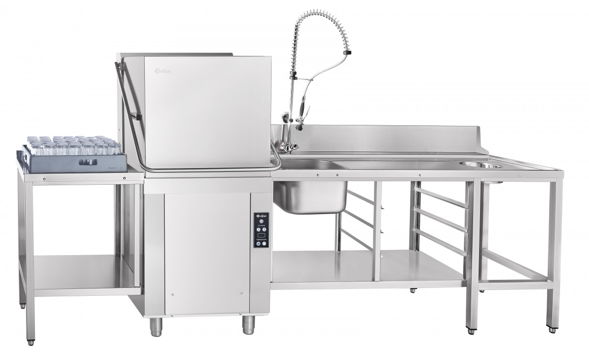 Стол предмоечный Abat СПМП-6-7 имеет отверстие для сбора крупных отходов, цельнотянутую ванну для предварительного ополаскивания посуды (400х400х250 мм), душирующее устройство для холодной и горячей воды, регулируемые по высоте ножки, нижнюю полку и направляющие для установки трех кассет 500х500 мм. Крепление к посудомоечной машине осуществляется с помощью верхнего зацепа и нижних винтов. Путем несложного монтажа стол можно установить как в левом, так и правом исполнении.