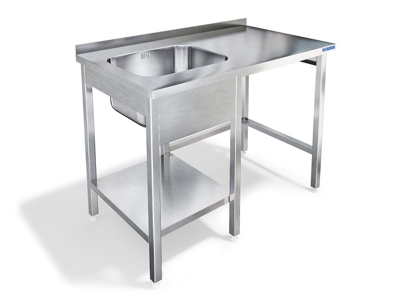 Ножки с регулятором высоты, разборный каркас. Столешница выполнена из нержавеющей стали AISI 304 толщиной 0,8 мм, каркас выполнен из трубы нержавеющей стали AISI 430 40х40 мм толщиной 1,2 мм, полка - из нержавеющей стали AISI 430 толщиной 0,8 мм.