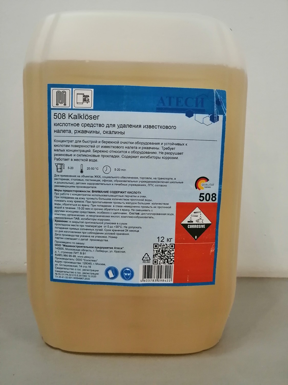 Средство для удаления известкового налета ATESY 508 прозрачная, бесцветная жидкость. Предназначено для очистки оборудования (кофемашин, теплового оборудования, стиральных машин, посудомоечных машин) и устойчивых к кислотам поверхностей от известкового налета и ржавчины. Требует малых концентраций. Не разрушает резиновые и силиконовые прокладки. Состоит из комплекса органических и неорганических кислот, НПАВ, ингибиторов коррозии. Основа метансульфоновая кислота. рН 2-3,5 Используется для удаления различных загрязнений, в особенности жиров, белков, известкового налета, минеральных отложений, ржавчины, пигментов. Жидкий, очень сильный препарат для декальцинации и очистки промышленного оборудования. Содержит ингибиторы коррозии последнего поколения. Средство для очистки поверхностей устойчивых к кислотам. Поверхности: Сталь, Металл, Стекло, Керамика/Фарфор, Полимерные материалы