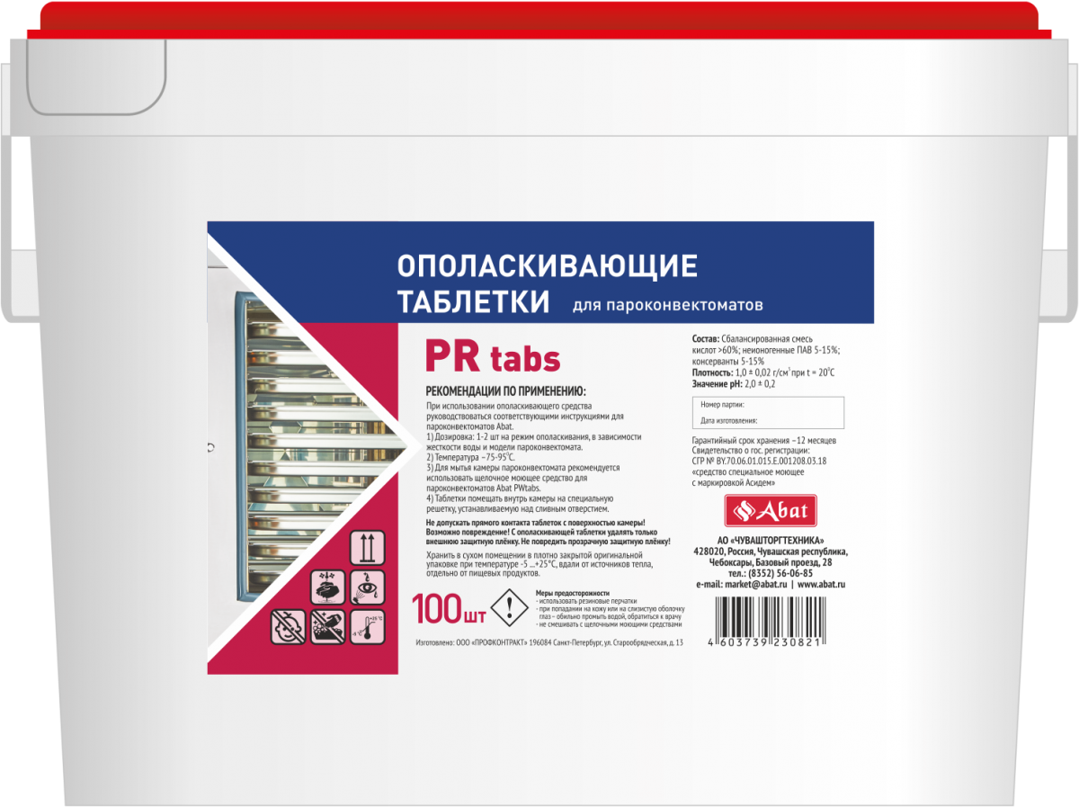 Ополаскивающие таблетки Abat PR tabs (100 шт) предназначены для ополаскивания камеры пароконвектомата. Применяются после моющих таблеток Abat PW tabs.