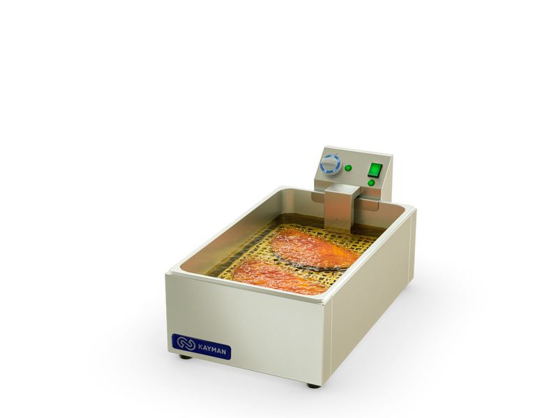 Чебуречница KAYMAN ЧЭ-2Е А используется на предприятиях общественного питания и торговли для приготовления чебуреков, пирожков и беляшей в разогретом масле (фритюре). Модель состоит из фритюрной ванны-гастроемкости GN 1/1-150 и блока управления, включающего ТЭН и терморегулятор. Корпус и ТЭН выполнены из пищевой нержавеющей стали.